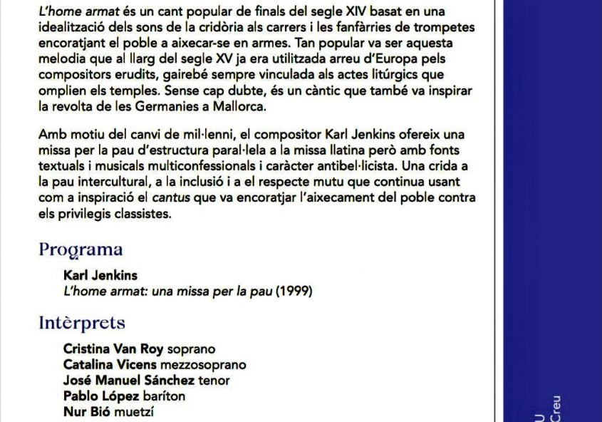 El dia 26 de novembre gran concert de la Capella juntament amb l’Orfeó Harpa d’Inca i la Banda Municipal de Música de Palma (Simfovents) oferint la magnífica “The armed man” una Missa per la Pau del britànic Karl Jenkins. Amb els solistes Cristina Van Roy, Catalina Vicens, Nur Bió, José Manuel Sánchez i Pablo López…