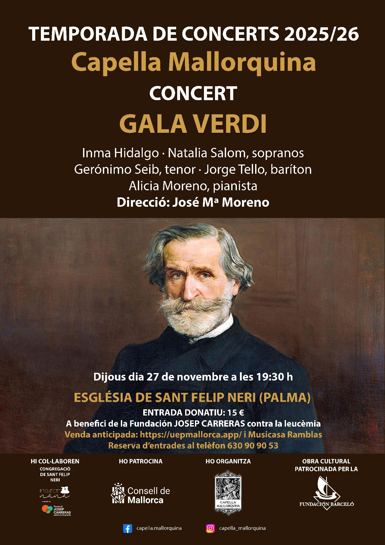 El dijous 27 de novembre, a les 19.30 hores, a l’Església de Sant Felip Neri, la Capella oferirà una gala lírica dedicada a Verdi, amb fragments d’òperes com La Traviata, Il trovatore, Macbeth o Rigoletto.Amb la pianista Alicia Moreno i els solistes Inma Hidalgo, Natàlia Salom, Jorge Tello i Gerònim Seib, la recaptació serà a…