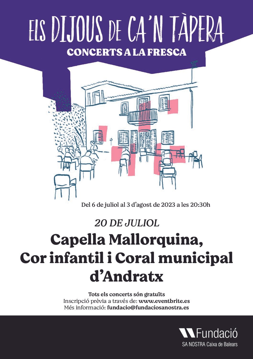 La Capella Mallorquina tanca la seva Temporada de Concerts 2022/23 amb un concert d’òpera i sarsuela al cicle Els Dijous a Ca’n Tàpera. Serà el proper dijous 20 de juliol a les 20:30 h. a Ca’n Tàpera juntament amb els Cors Petitons i Infantil d’Andratx i la Coral Municipal d’Andratx. No vos ho perdeu. Entrada…