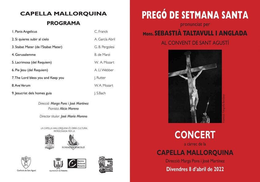 El próximo viernes día 8 de abril a las 21:00 h. la Capella Mallorquina cantará en el Convento de San Agustín de Felanitx un concierto de música sacra con motivo de la celebración del Pregón de Semana Santa que pronunciará el Obispo de Mallorca.