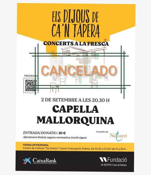 Sentimos mucho comunicaros que, debido a las condiciones meteorológicas que se anuncian, la Fundación Sa Nostra ha decidido cancelar nuestro del concierto de mañana jueves. Pero muy pronto, estaremos de nuevo con vosotros en nuestro próximo concierto del día 24 de septiembre.