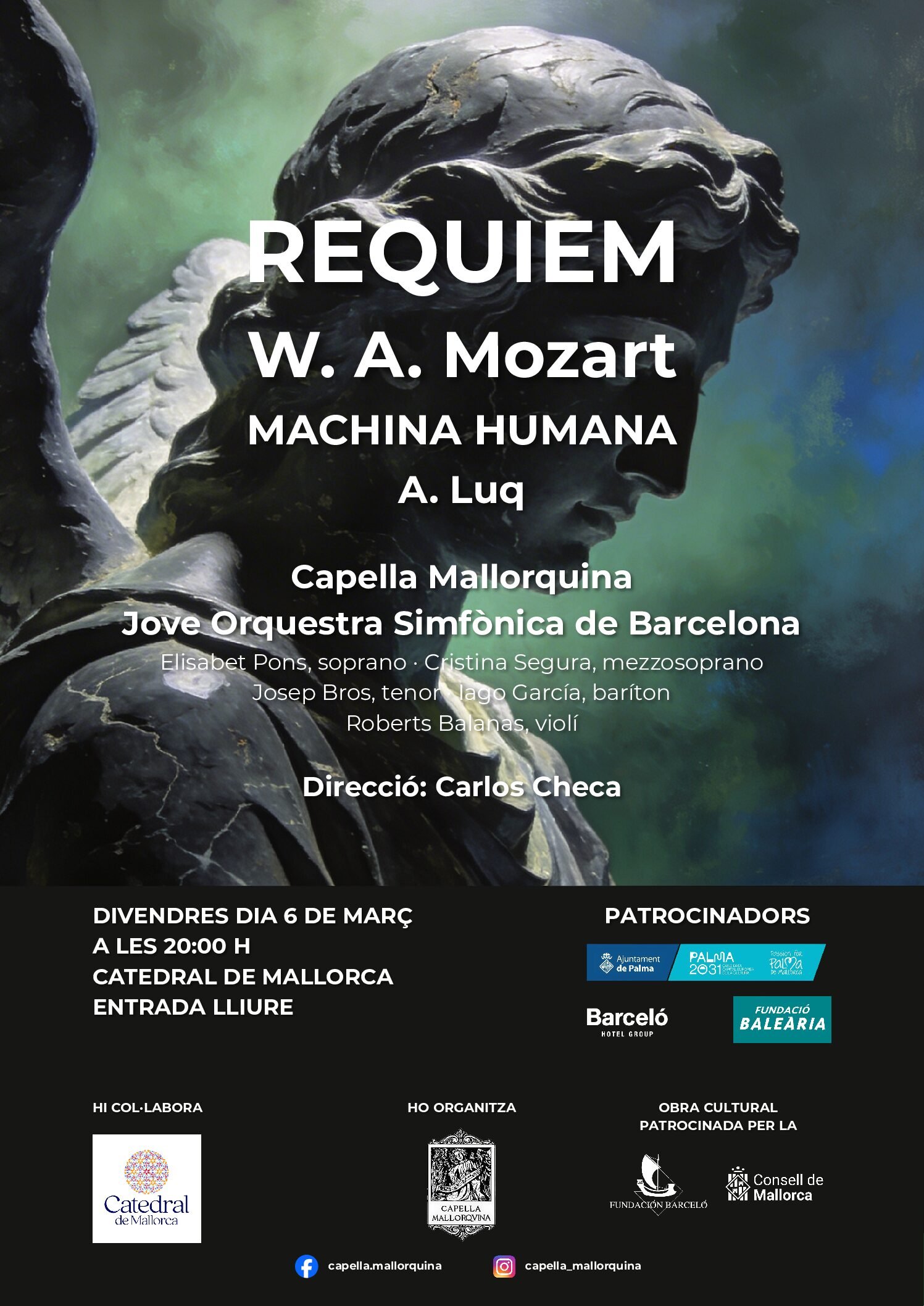 La Capella presenta su nuevo gran proyecto. Nada menos que el Requiem de Mozart en la Catedral de Mallorca y junto a la estupenda Jove Orquestra Simfònica de Barcelona. Será el viernes 6 de marzo a las 20,00 h y con entrada gratuita. El concierto, que será dirigido por Carlos Checa, contará con un magnífico elenco de solistas liderado por el prestigioso tenor José Bros, que estará acompañado por las voces de Elisabet Pons, Cristina Segura y Iago García. El programa se completará con el estreno absoluto de la obra “Machina Humana” de la compositora A. Luq con el fantástico violinista, Roberts Balanas.