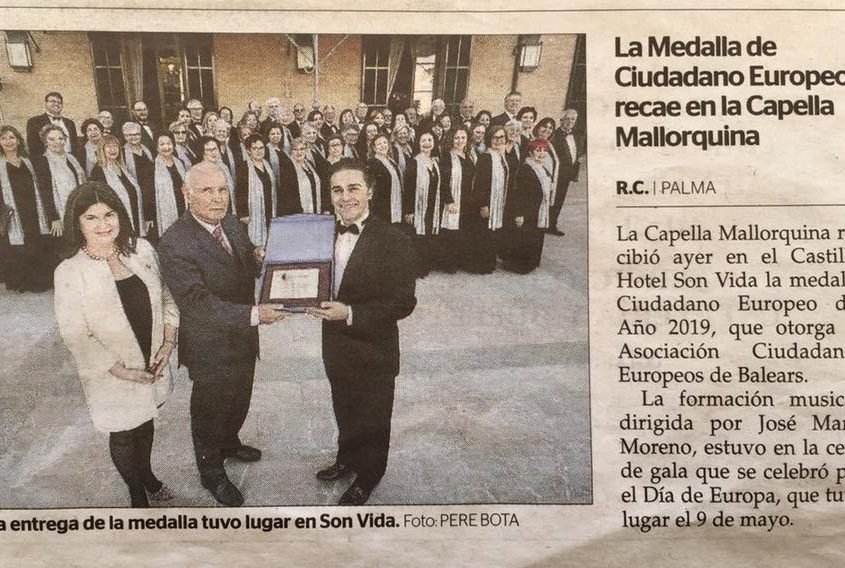 La Capella Mallorquina ha estat guardonada amb el Premi Ciutadans Europeus de l’any 2019 que concedeix l’Associació Ciutadans Europeus de Balears. L’acte de lliurament es va celebrar al Castell Hotel Són Vida on la Capella va oferir un concert.